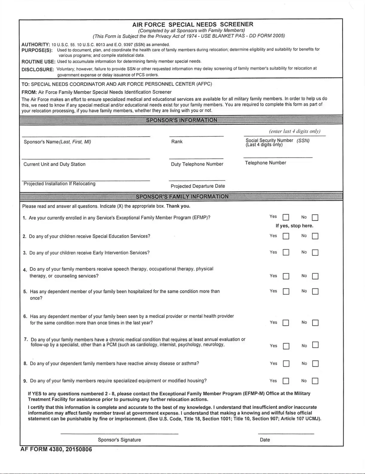 Additionally, not contacting the Exceptional Family Member Program (EFMP) when necessary is a common oversight. If a sponsor answers "yes" to any questions numbered 2-8, they are instructed to reach out to the EFMP office. Ignoring this step can complicate the relocation process and potentially affect eligibility for necessary services.