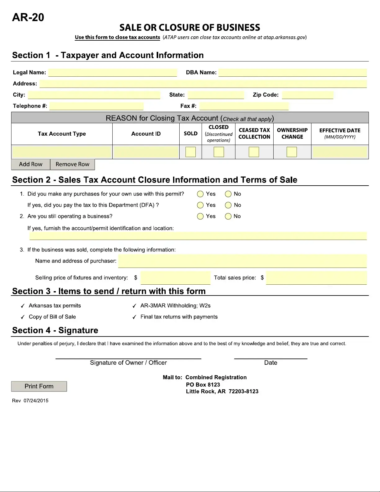 The AR-20 form is also comparable to the IRS Form W-2, which employers use to report wages paid to employees. Both forms require information about the taxpayer and their financial activities. The W-2 provides details about income and tax withholdings, while the AR-20 focuses on closing a business's tax accounts. Despite their different purposes, both forms are vital for ensuring compliance with tax obligations.