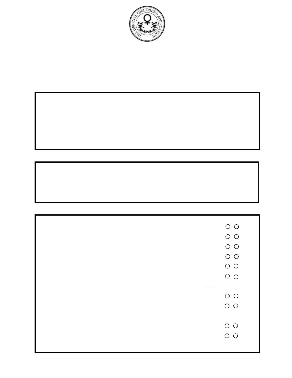 The Girlfriend Application form bears resemblance to a job application. Both documents require individuals to provide personal information, such as contact details and background. In a job application, candidates highlight their skills and experiences, while the Girlfriend Application may ask about interests and relationship preferences. Each form aims to assess compatibility and suitability, whether for a role in a company or a romantic partnership.