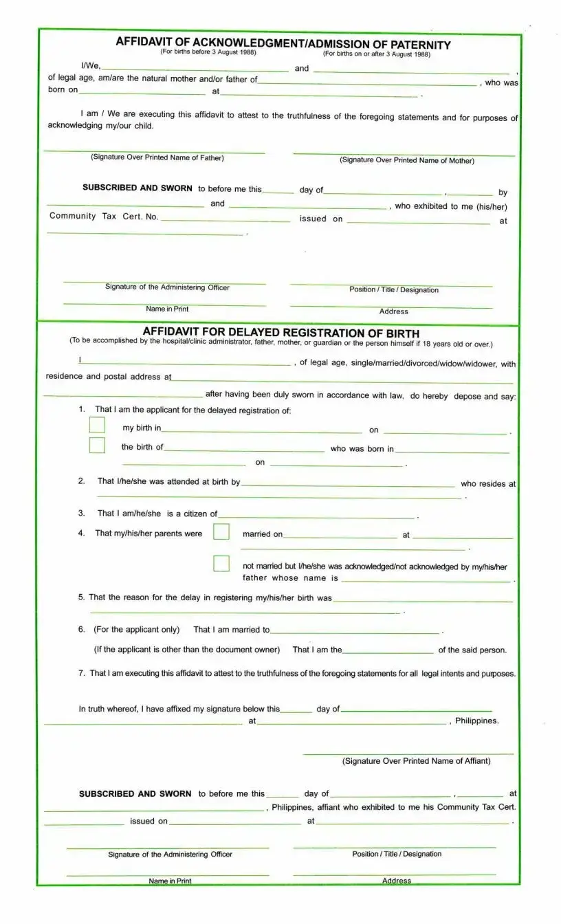 The Delayed Registration of Birth Affidavit is also comparable. This document is used when a birth is not registered within the standard timeframe. It allows individuals to provide a sworn statement detailing the circumstances of the birth and the reason for the delay. Similar to the Municipal Form No. 102, it captures vital information about the child and parents, ensuring that the birth is eventually recorded in the official registry.