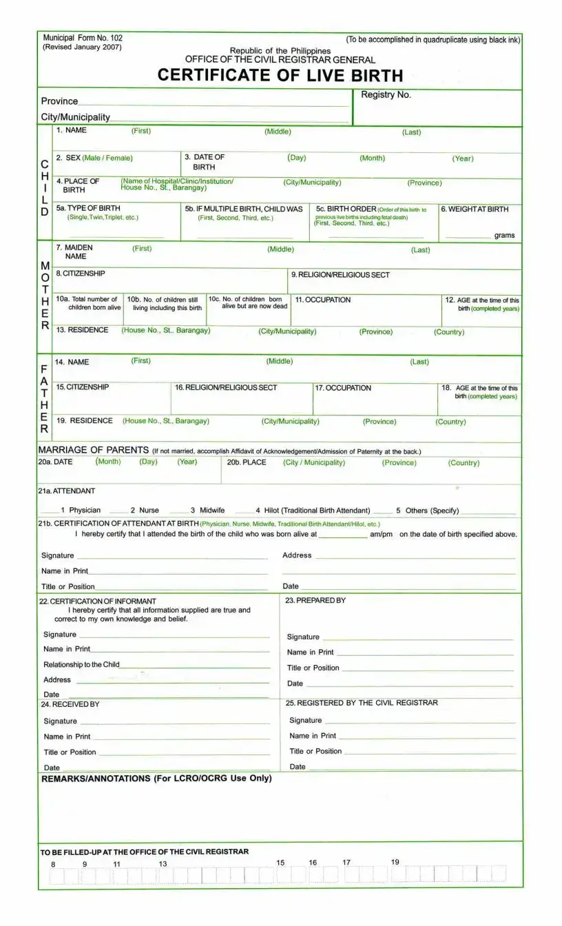The Certificate of Live Birth from a hospital is another related document. This certificate is usually issued by the medical facility where the birth took place and contains similar information to the Municipal Form No. 102. It serves as a preliminary record that parents can use to fill out the Municipal Form No. 102, ensuring accuracy in the registration process.