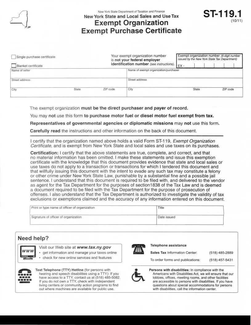 The Certificate of Exemption (Form ST-5) issued by the New York State Department of Taxation and Finance is akin to the ST 119.1 form. This certificate is designed for certain types of organizations, including government entities and nonprofit organizations, allowing them to make purchases without incurring sales tax. Like the ST 119.1, the ST-5 must be presented at the time of sale and is valid for a specified period. Both forms require accurate completion and the signature of an authorized representative to ensure compliance with tax regulations.